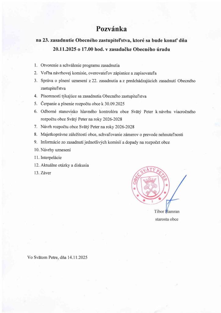 Pozvánka na 23. zasadnutie Obecného zastupiteľstva, 20.11.2025