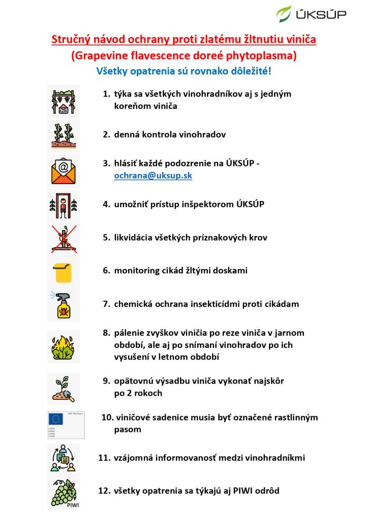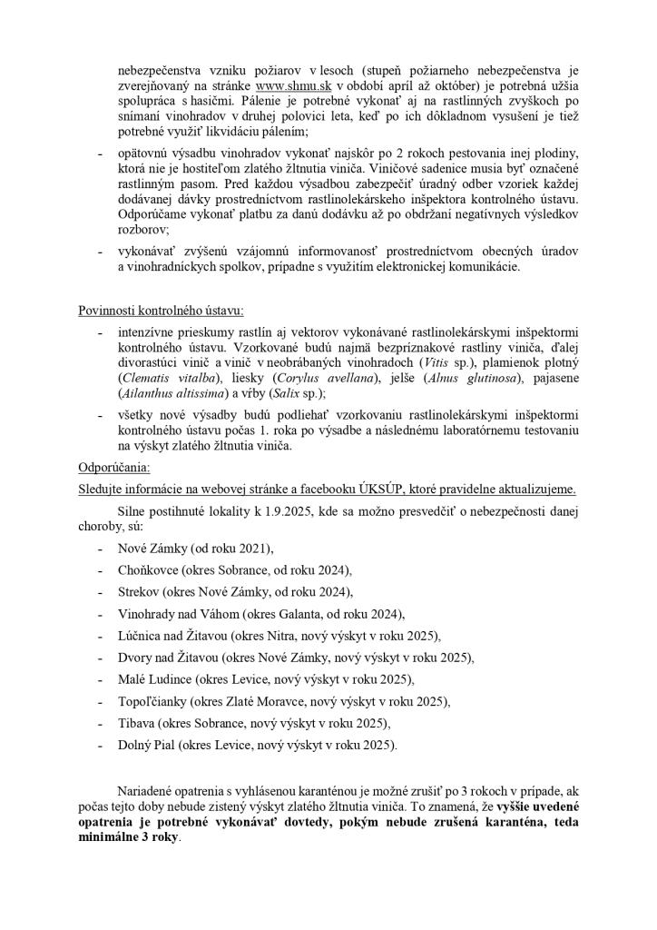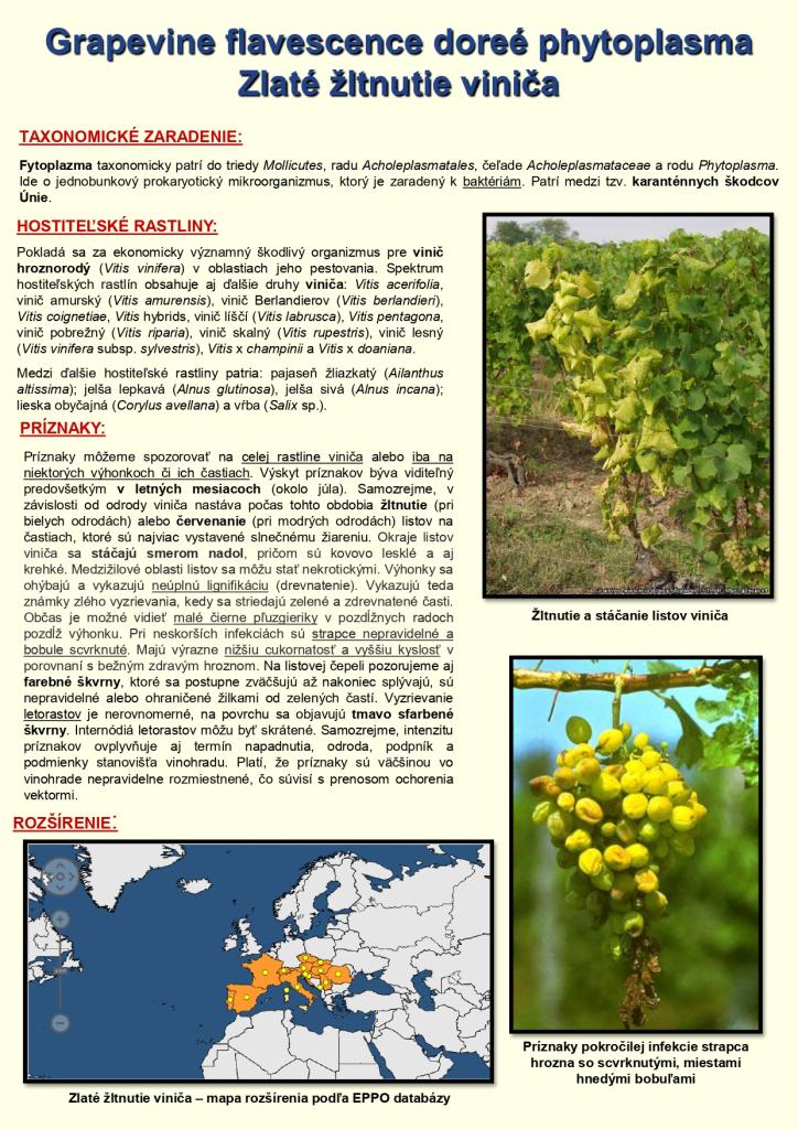 Vzhľadom na rýchly nárast viditeľných príznakov karanténnej choroby viniča s názvom zlaté žltnutia viniča, odbor ochrany rastlín Ústredného kontrolného a skúšobného ústavu poľnohospodárskeho v Bratislave týmto oznamuje všetkým pestovateľom viniča, že je nevyhnutné prijať účinné opatrenia na zamedzenie šírenia tejto choroby.
